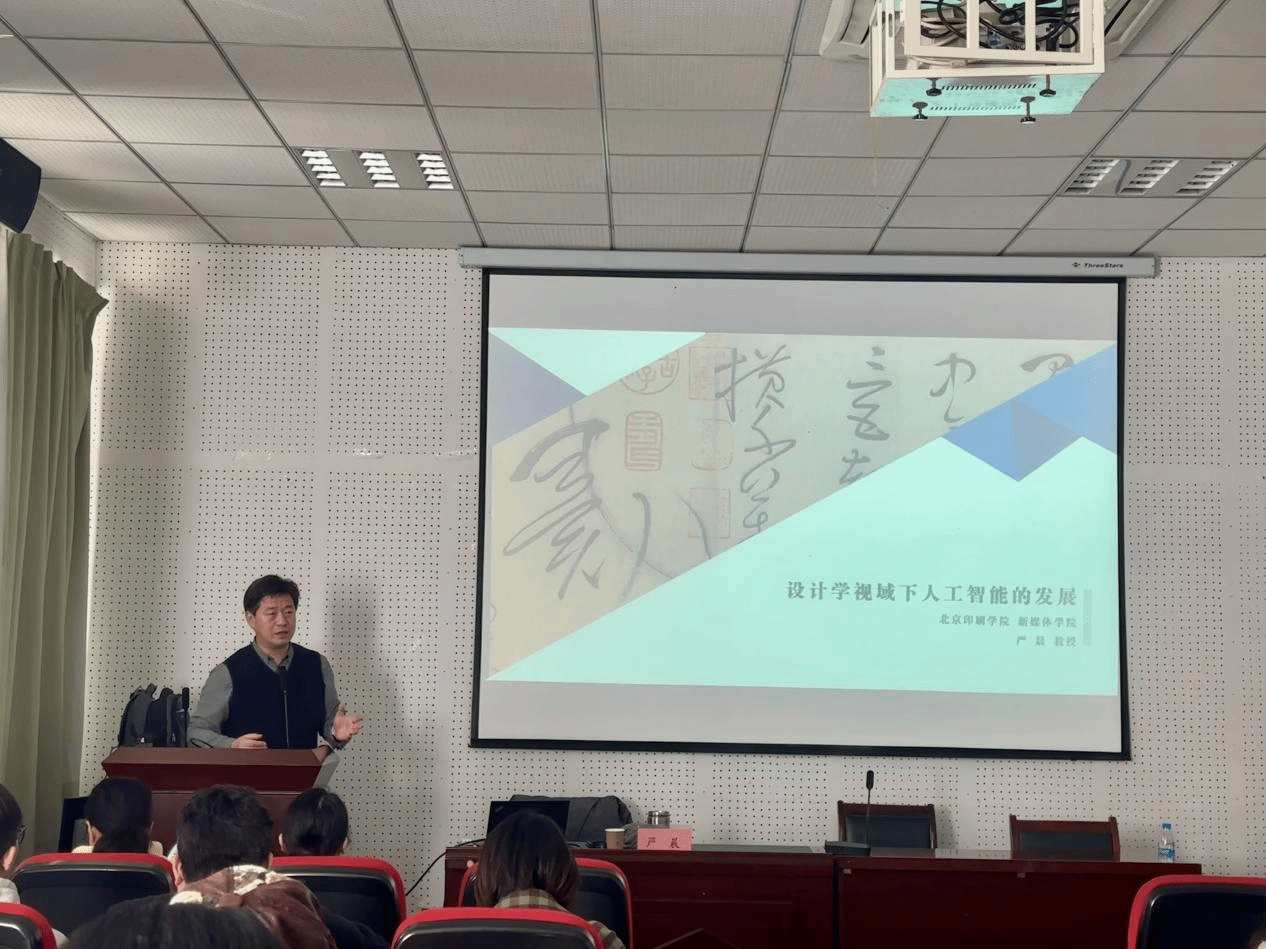 讲座中,严晨教授围绕人工智能为设计学发展提供新空间、关于人工智能、关于人工智能与设计学关系的展望三大主题展开,为在场师生打开了研究的新视角。强调了未来跨学科的发展趋势,通过引用一系列人工智能设计的实际案例,阐述了当前设计师及设计行业,乃至与计算机融合的各个领域,都迫切需要掌握和融入人工智能技术。他认为,作为新时代新设计人,应尽快熟练运用这一技术,不仅能显著提升工作效率,还能极大增强工作的精确性。