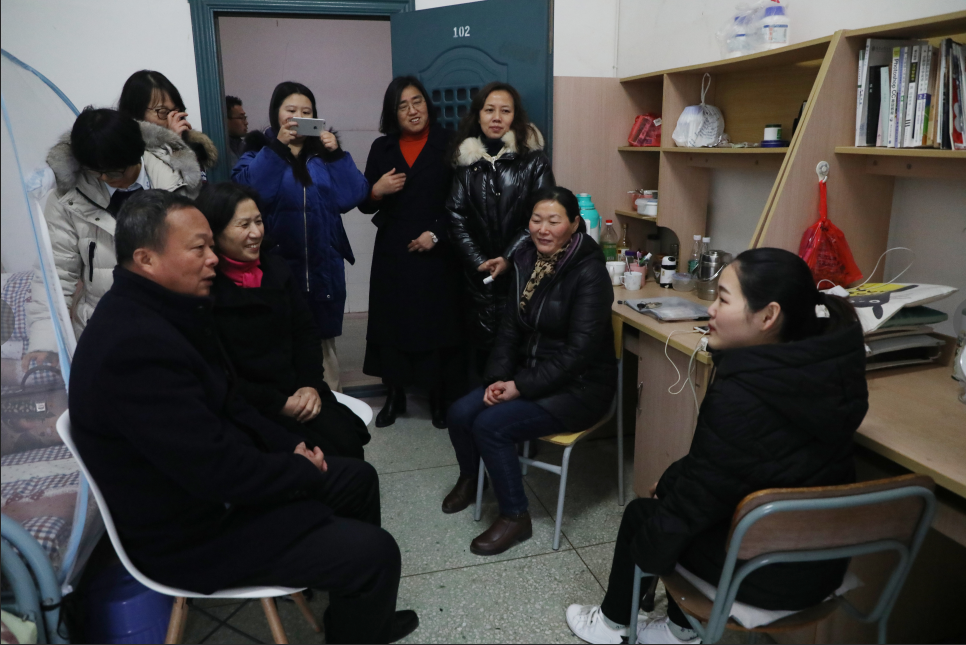 201917日下午,校党委副书记张立青,学生工作处处长胡盛华,学生资助管理中心主任高丽明,学院党委副书记王锐以及辅导员、班主任深入学生宿舍走访慰问家庭经济困难学生吴虹及吴虹陪读家长,为吴虹同学送上慰问金。