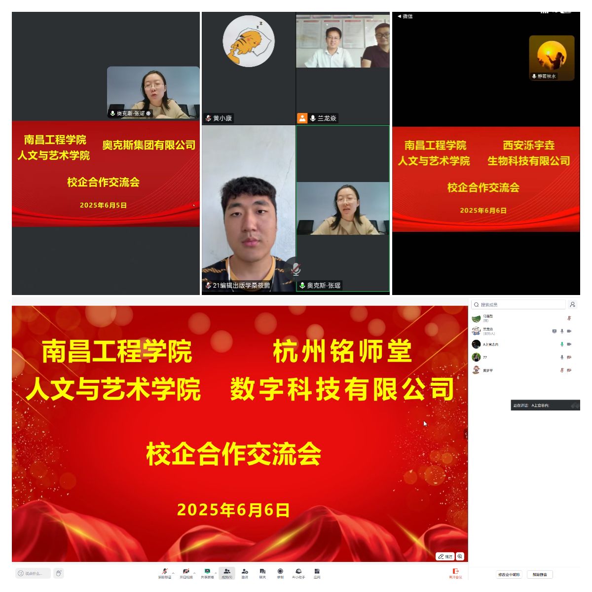 6月5日-6日,学院通过线上会议形式开展访企专项活动,与奥克斯集团有限公司、西安泺宇垚生物科技有限公司、杭州铭师堂数字科技有限公司三家企业负责人进行深入交流。院党委副书记、辅导员及2025届毕业生代表参加活动。