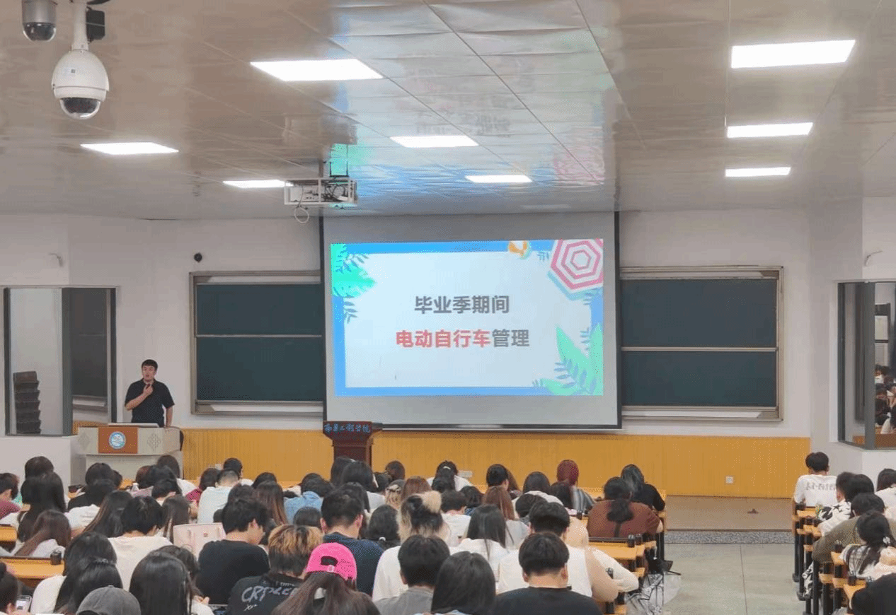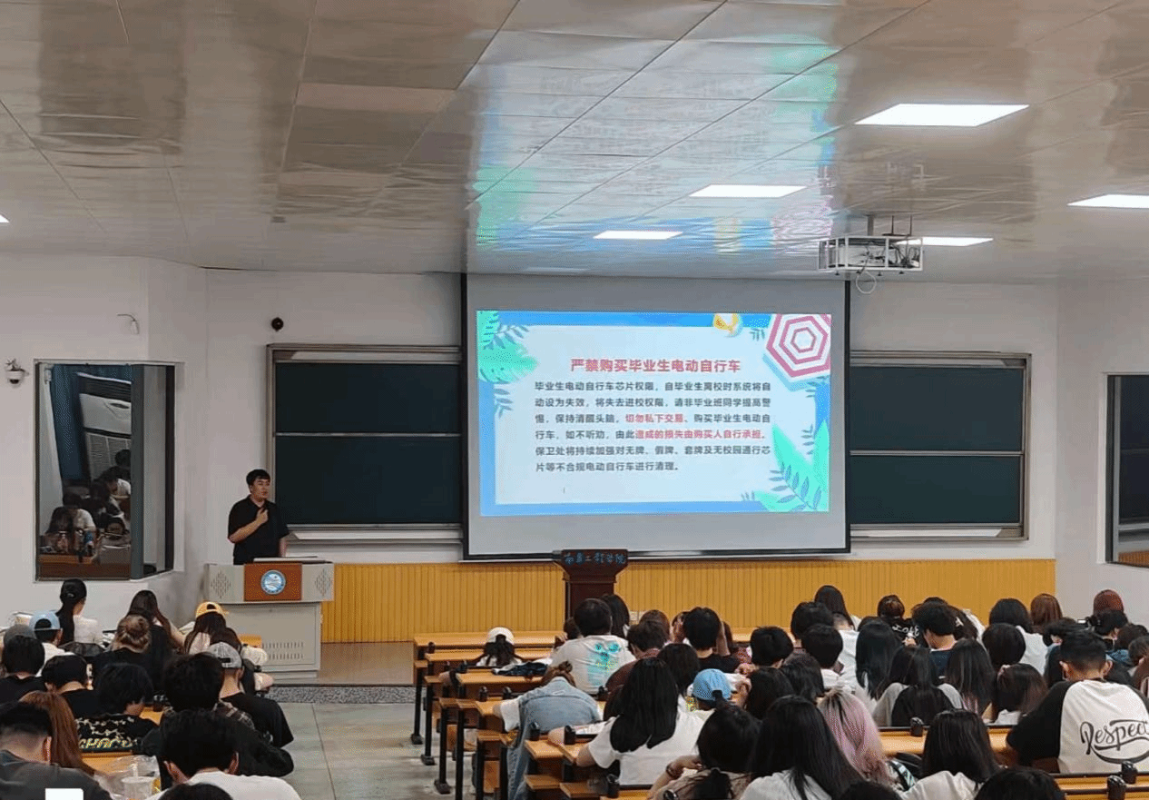 在学生干部大会上,辅导员向学生干部强调,毕业生离校前需及时归还电动自行车通行芯片,并同步将车辆带离校园,不得在校内进行二手交易、转赠或租借。同时提醒非毕业班学生,通过班会强调“三个严禁”要求:严禁购买毕业生电动自行车,严禁参与任何形式的私下交易,严禁各类违规骑行、停放及充电行为。