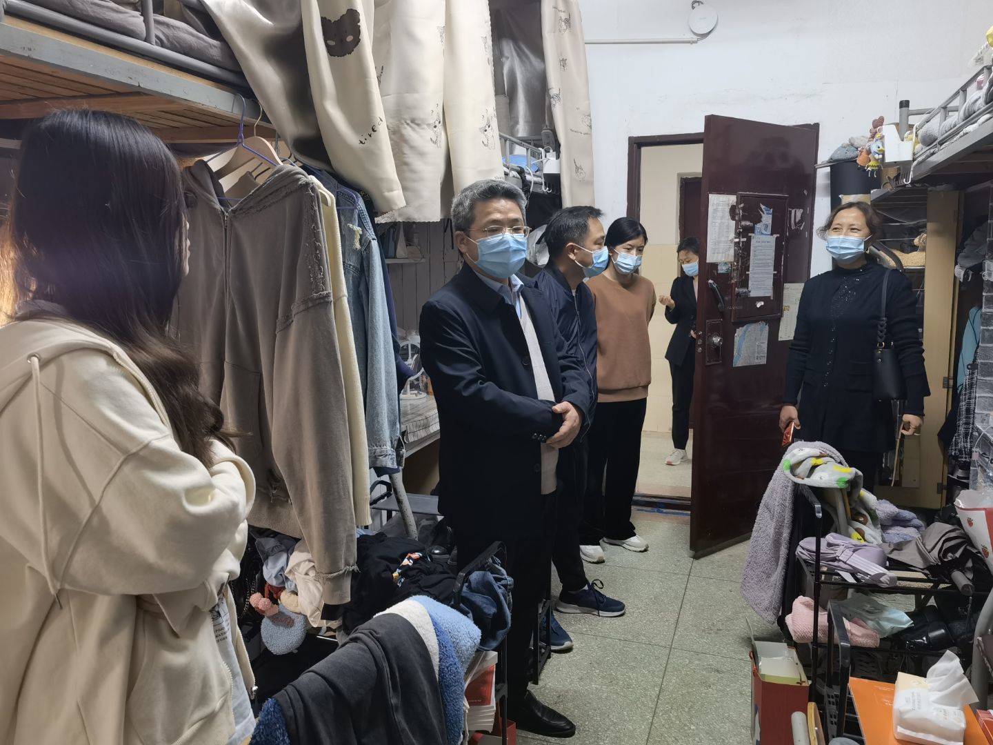 在疫情防控期间,学生宿舍不仅仅是生活场所也是学习场所,校领导一直关心学生的线上学习、生活和心理情况,曾多次走访学生宿舍。校领导一行在走访过程中与同学们进行了亲切交流,详细了解学生们的心理情况、线上学习情况及封闭管理后的校园生活。校领导们还不断叮嘱同学们要严格遵守疫情防控期间校园管理要求、做好疫情防控常态化下的自我管理和个人防护,养成良好的生活卫生习惯,注意身体健康,保持积极的心理状态,共同营造安全有序的校园环境。随后,校领导一行还去看望慰问了我院在校内疫情防控执勤点的学生志愿者,详细了解了学生志愿者值守轮换、后勤保障等工作情况,并高度赞扬了学生志愿者们“逆行”而上、挺身而出的勇气和毅力。