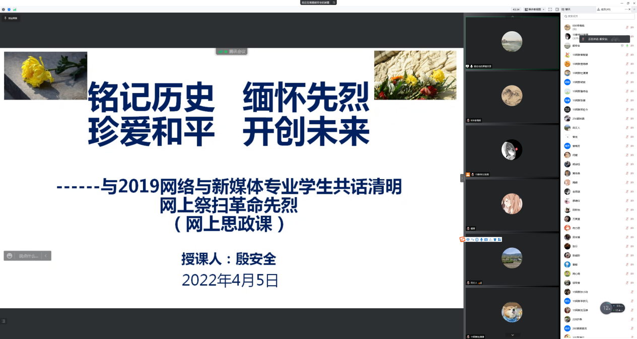 4月5日下午,校纪委书记殷安全通过腾讯会议为人文与艺术学院师生上了一堂“铭记历史缅怀先烈 珍爱和平开创未来”清明节线上祭扫革命先烈思政课,人文与艺术学院党委书记熊华林等四位老师和19网络与新媒体专业全体同学参加本次课程。