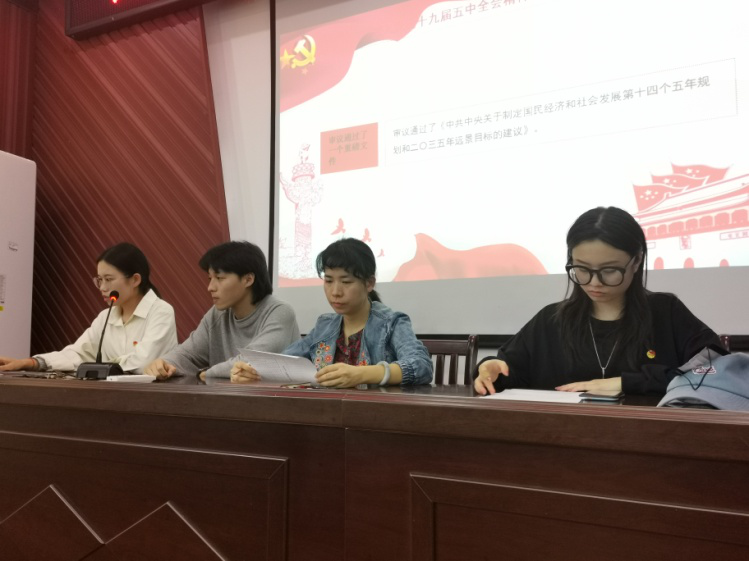 为深入学习贯彻习近平总书记在党的十九届五中全会上的重要讲话精神,人文与艺术学院团委于11月18日在艺术楼A230组织学习党的十九届五中全会精神。院团委副书记丁蓓蒂为主讲人,分团委学生副书记张星雨、组织部全体干事及全体团支书参与。