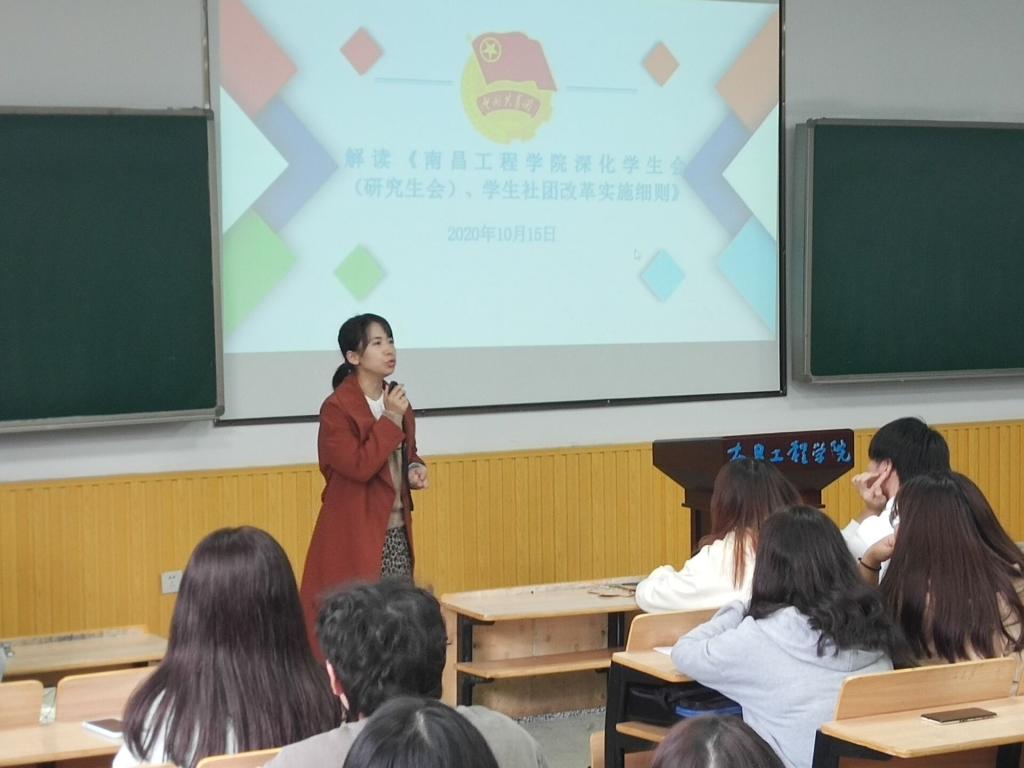 丁老师对《南昌工程学院深化学生会(研究生会)、学生社团改革实施细则》进行解读。首先详细介绍了本次学生会改革的政策依据,也简单介绍了中共教育部党组、共青团中央《高校学生社团建设管理办法》和学校内出台的一些政策文件。随后从强化党的领导、改革运行机制、精简组织机构、提升学生干部标准等七个方面对这些政策文件进行详细解读。