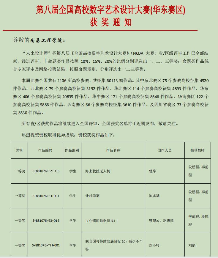 近日,“未来设计师”杯第八届《全国高校数字艺术设计大赛》(NCDA大赛)华东赛区圆满落幕,我校人文与艺术学院教师段鹏程、李前程指导的作品《海上救援无人机》,刘焰指导的《联合国可持续发展目标10:减少不平等》,陈檀指导的《少女插画》和杨婷指导的《走近图什业图亲王府》等作品分别荣获一等奖,我校共选送120件作品参赛,共斩获一等奖6项,二等奖10项,三等奖14项。
