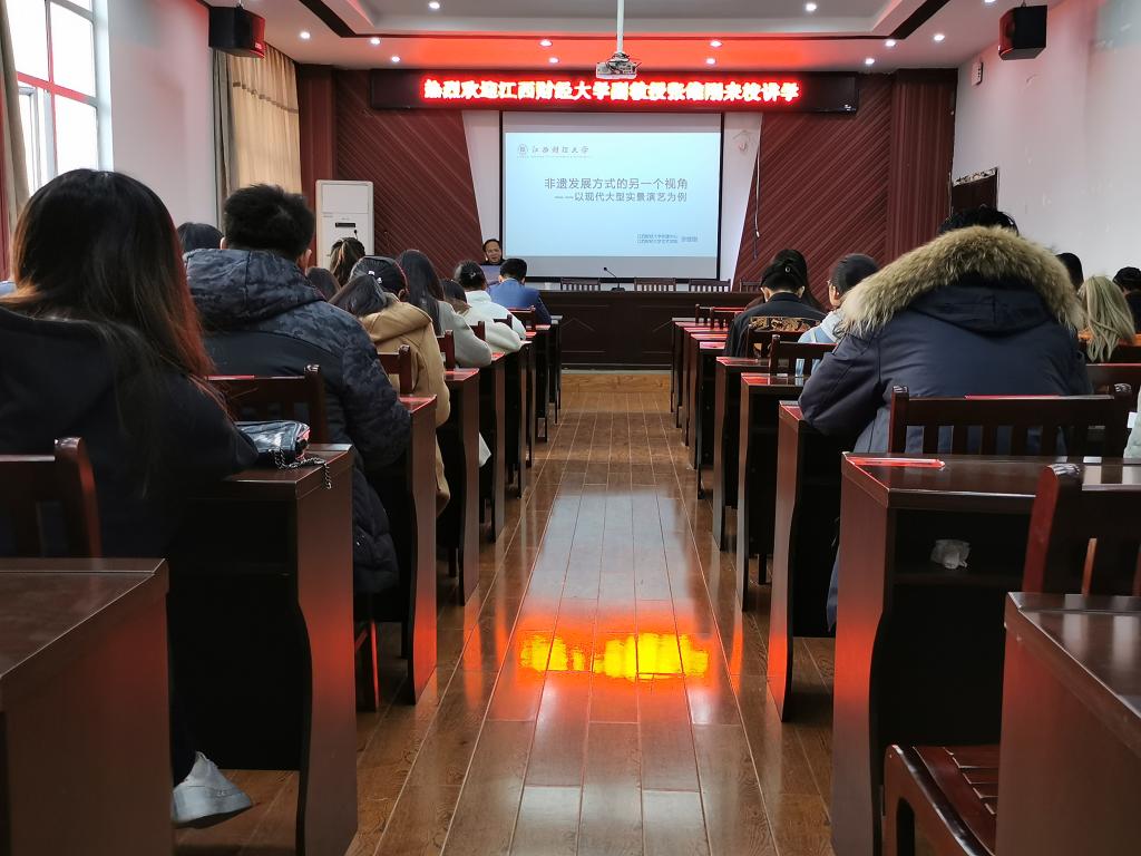1213日,江西财经大学张维刚副教授应邀做客“鄱湖学术讲坛”,在艺术楼A230会议室作了一场主题为“非物质文化遗产传承发展的现代方式--以现代大型实景演艺为例”的学术讲座,共有师生100余人聆听了讲座。