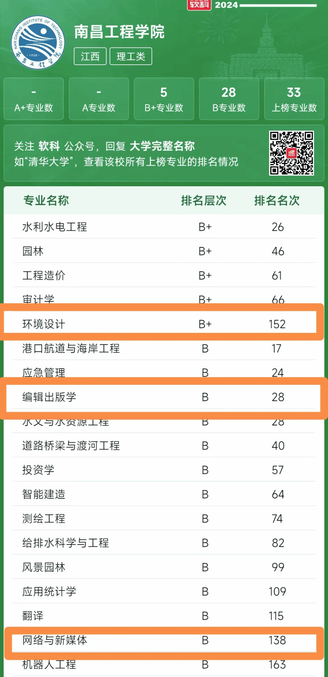 高等教育专业评价机构软科正式发布2024“软科中国大学专业排名”。我校共有33个上榜,其中我院环境设计专业获评B+,网络与新媒体、编辑出版学2个专业获评B。(文/图 王丹)