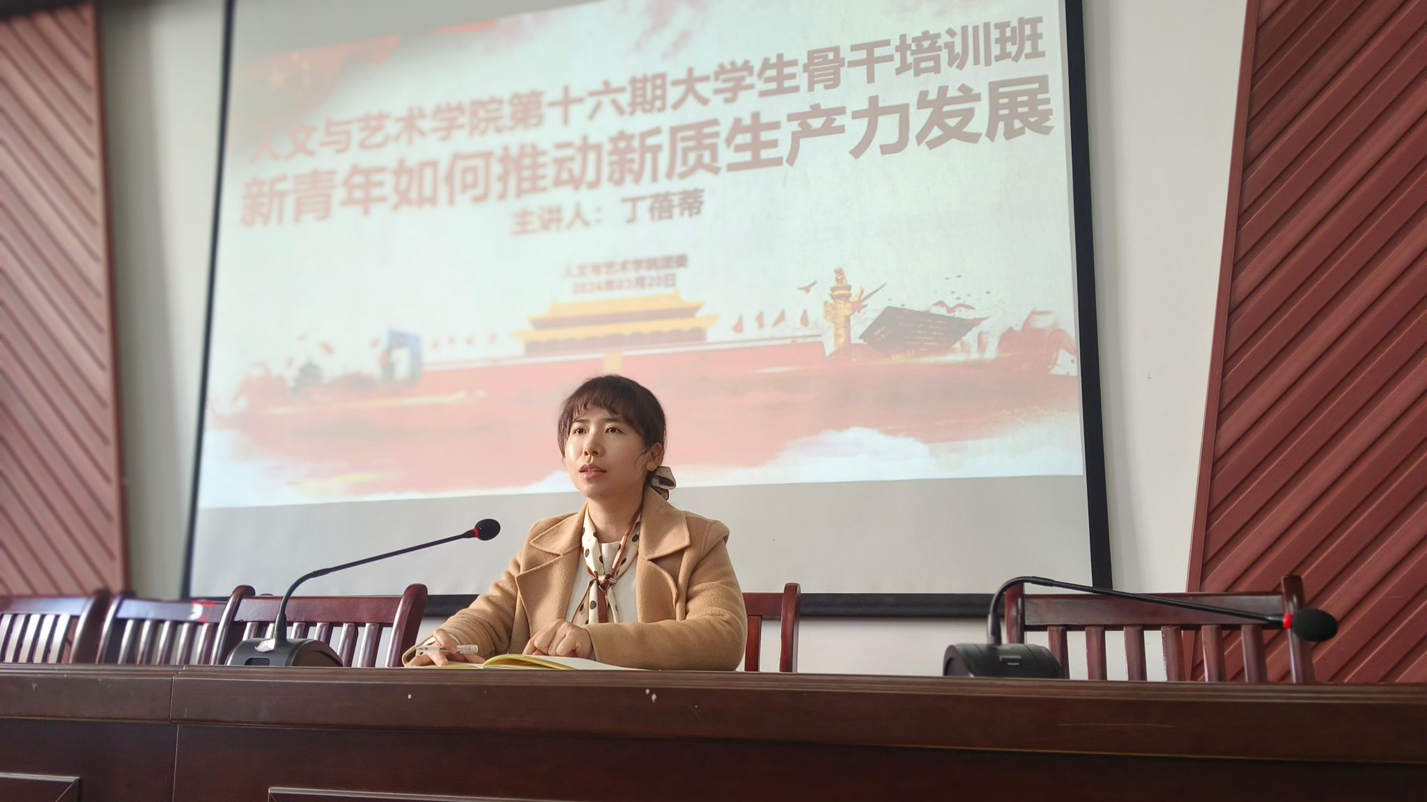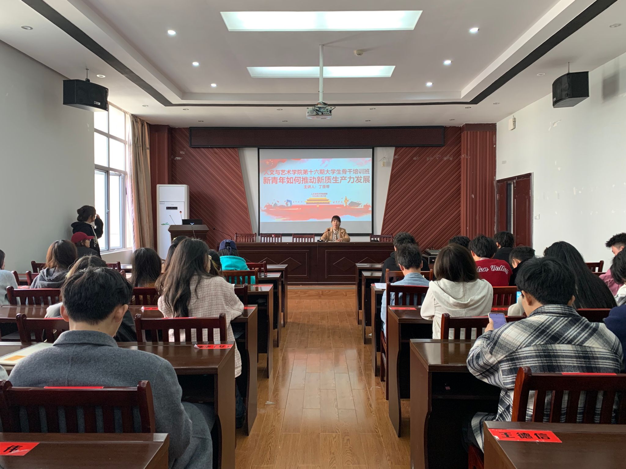 人文与艺术学院于3月20日在艺术楼A230开展院第 16 期大学生骨干培训班。本次培训课由学院团委书记丁蓓蒂主讲,以“新质生产力”为主题,给学院各班级团支书和团委学生会干部代表开展思想培训。