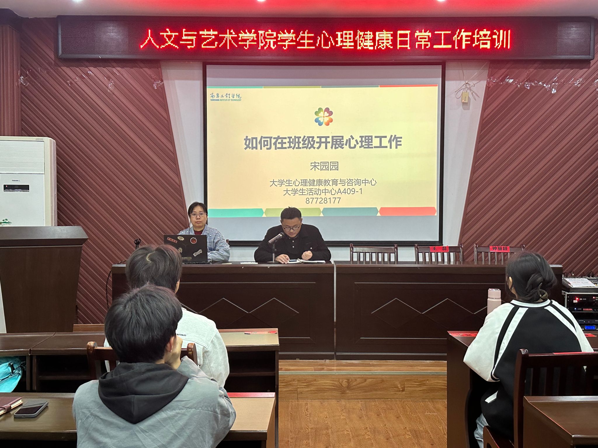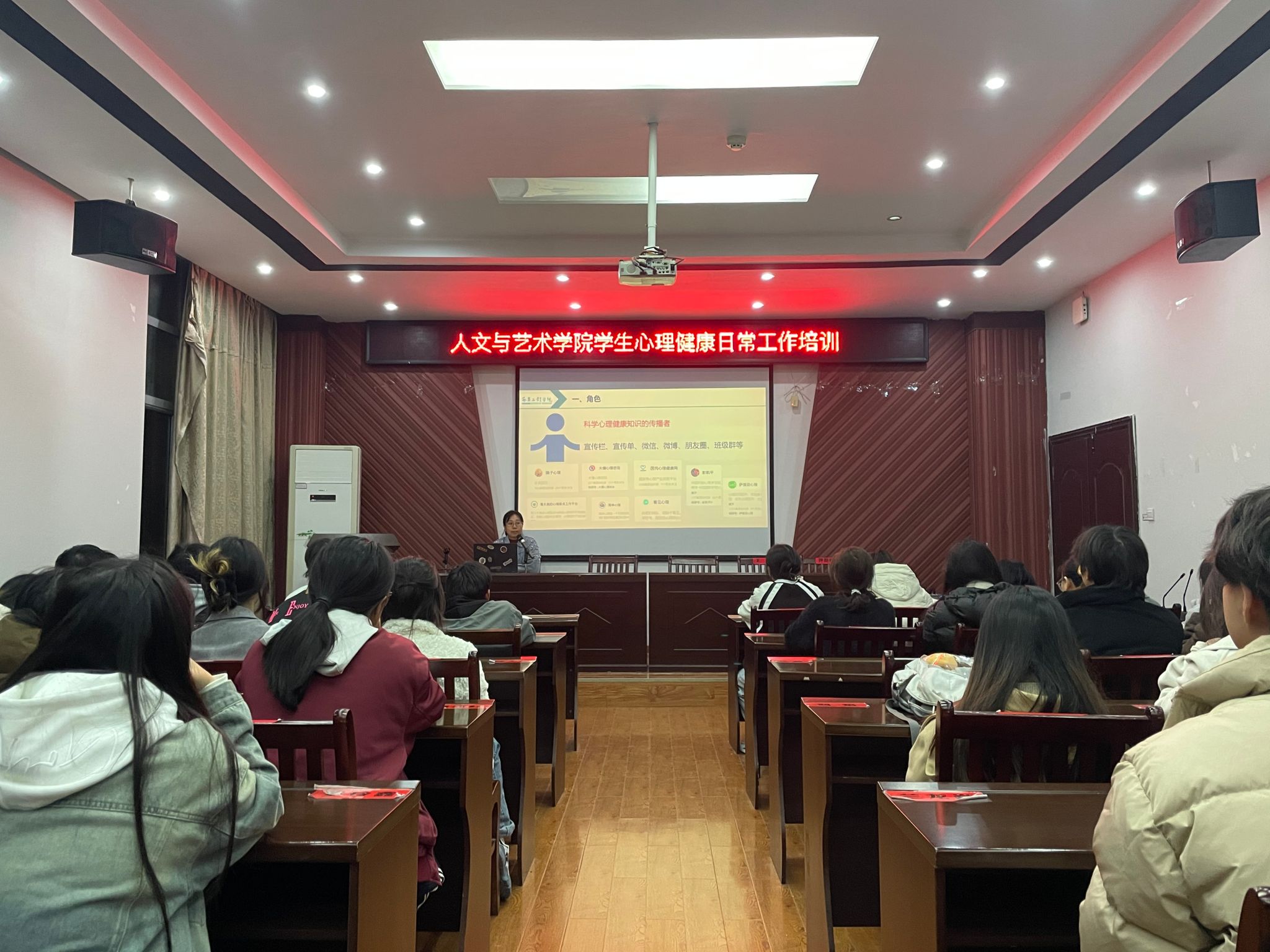 为加强大学生心理健康教育工作,提高学院班级心理委员的工作能力和责任意识,11月26日晚,人文与艺术学院在艺术楼A230开展心理健康日常工作培训,校心理中心宋园园老师为主讲嘉宾,学院辅导员兰龙焱以及各班级班长兼团支书、心理委员共80余人参与。