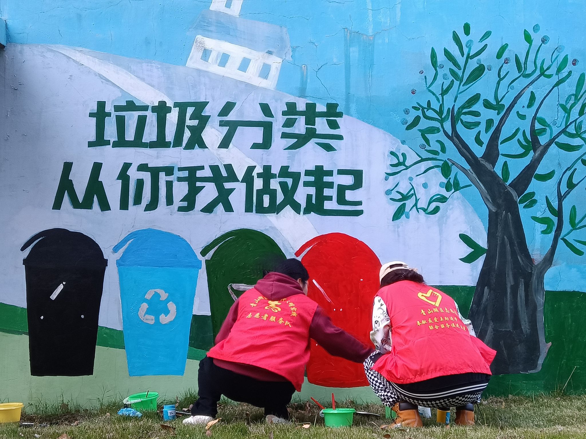 阳光正好,二十多位志愿者们于京荣社区集合,开始“井”字描画与墙壁涂鸦,大家手持颜料和画笔,在调色盘中调制颜料,以井盖为画纸,经过细心勾勒轮廓形、刷底色、填色、修边等程序,绘制出来丰富多彩带有绿色环保标识的井盖。