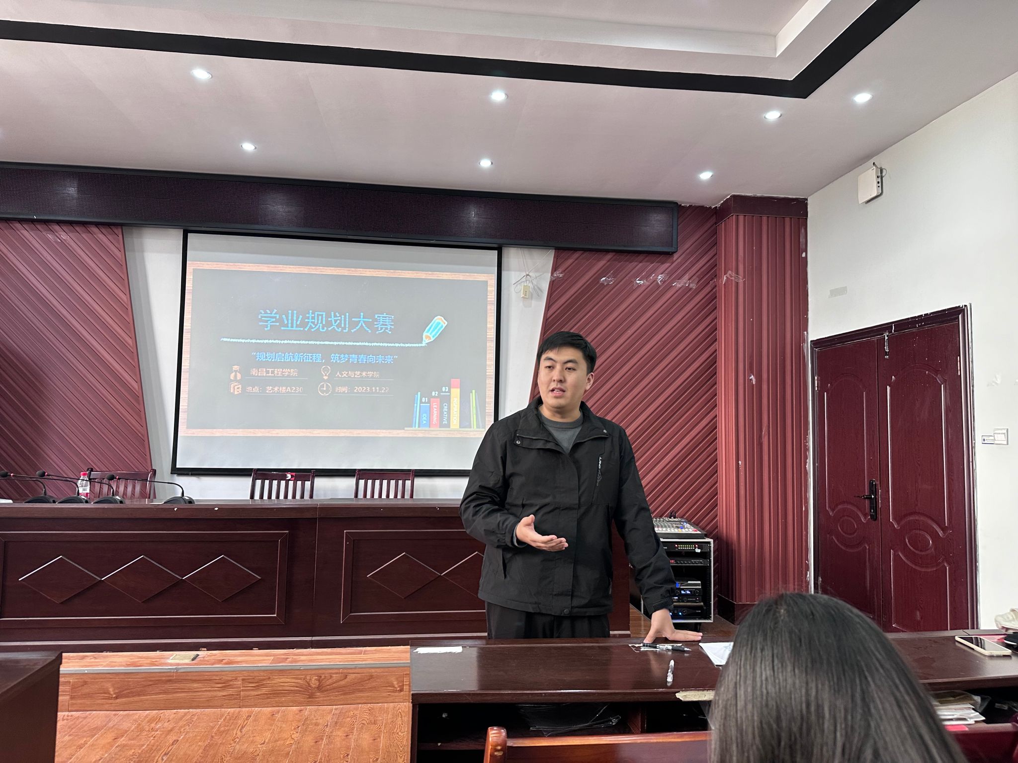 为了更好地实现以赛促学、以赛促教,引导大学生树立正确的成才观、就业观和择业观。人文与艺术学院于23年11月22日在艺术楼A230开展学业规划大赛。本次大赛由辅导员兰龙焱、马浩哲老师及分团委学生副书记赵文敏担任评委。